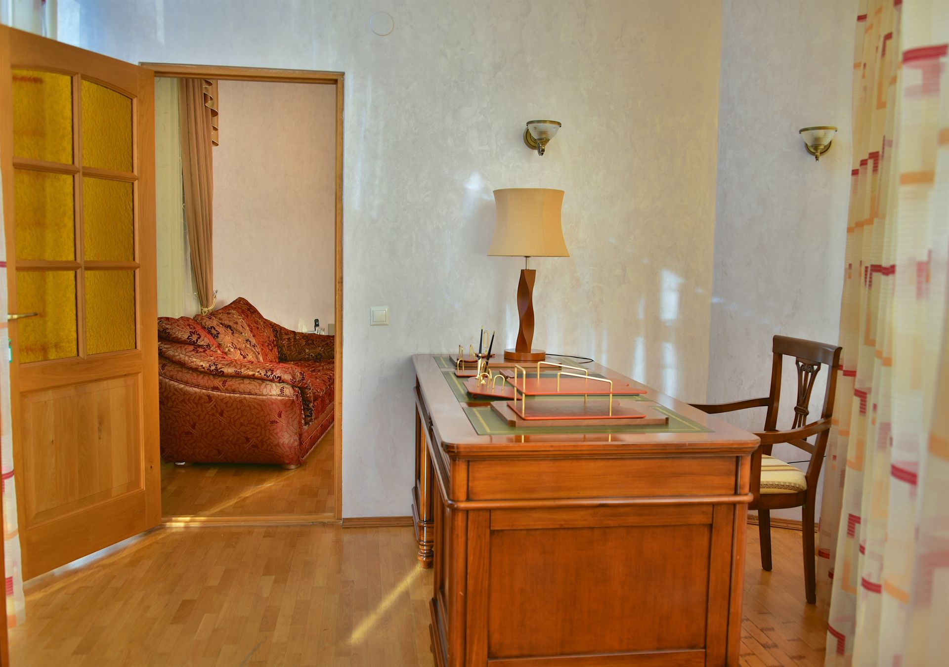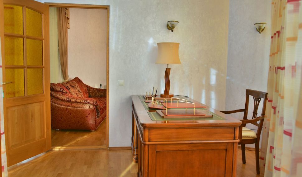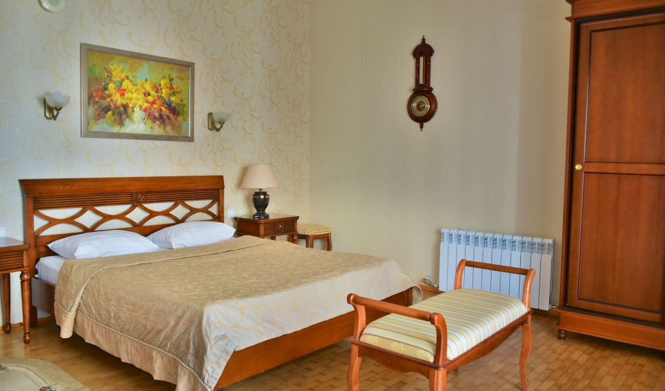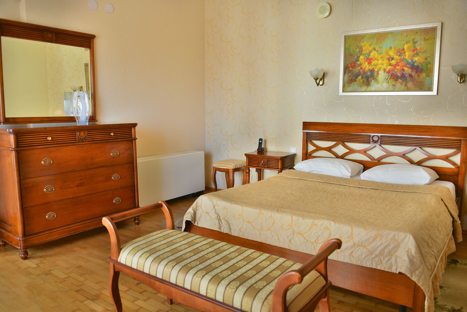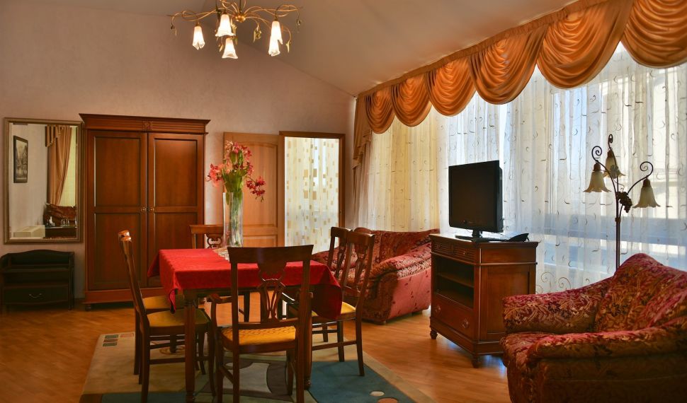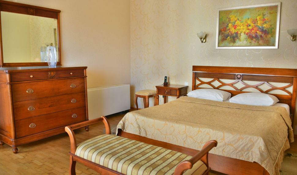 Spacious two-bedroom suite furnished with soft furniture. The living room includes a sofa, two armchairs, coffee table, dining table with chairs, TV, and safe. The bedroom features a French double bed with bedside tables, dressing table with mirror, bench, and wardrobe. The bathroom includes a large bathtub, hairdryer, and toiletries kit. The suite also has a study area: writing desk, desk lamp, chair, and bookshelf.