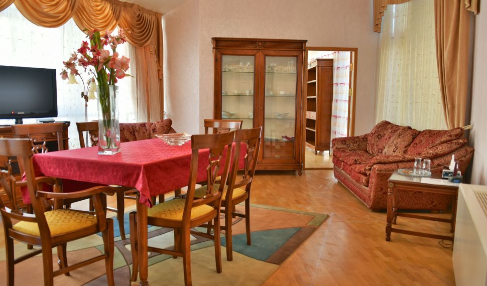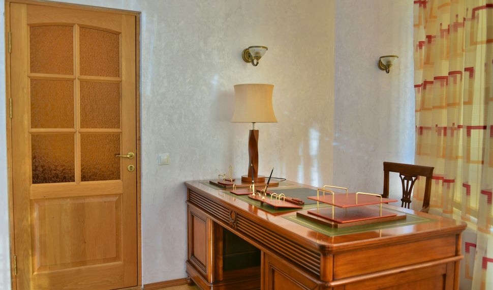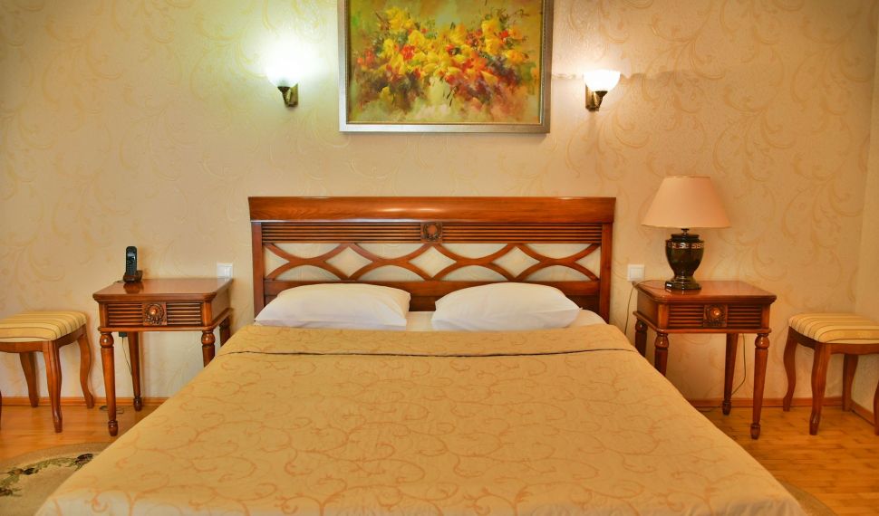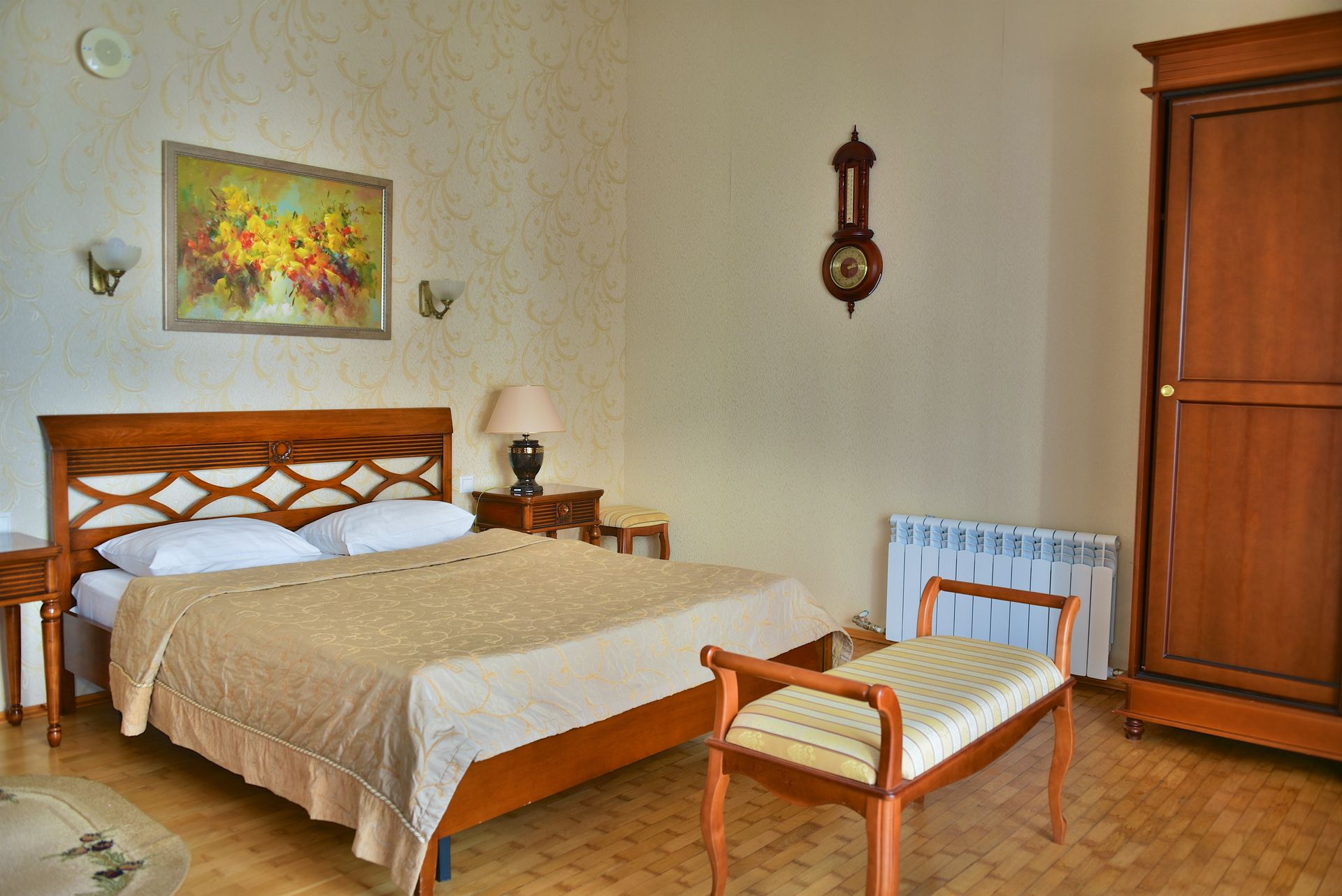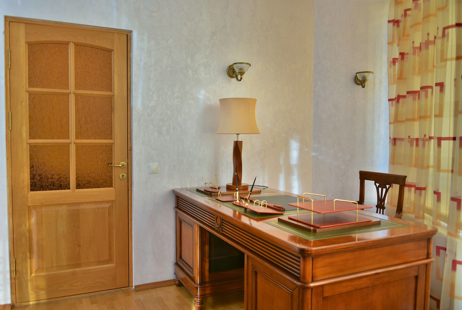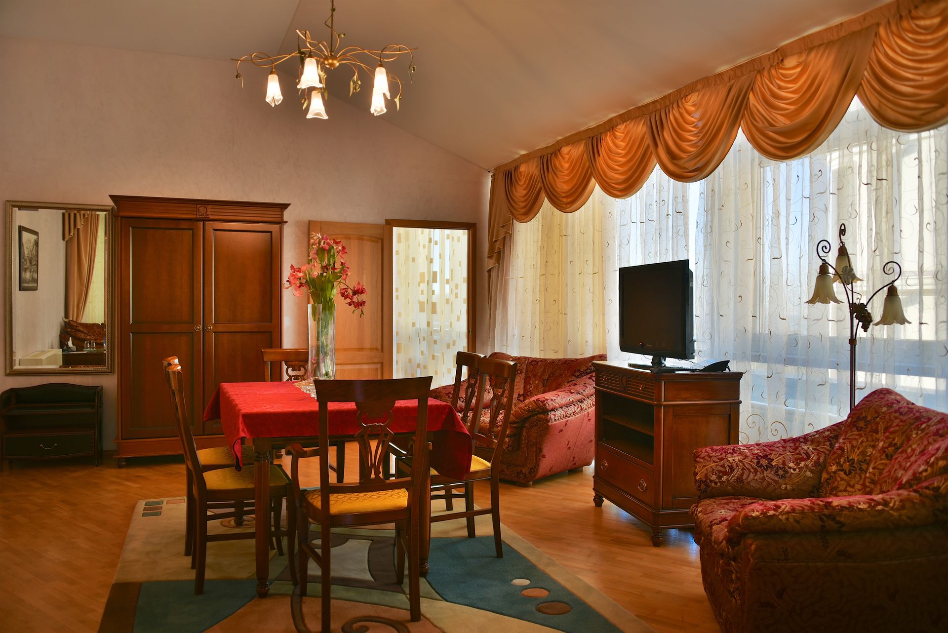 Spacious two-bedroom suite furnished with soft furniture. The living room includes a sofa, two armchairs, coffee table, dining table with chairs, TV, and safe. The bedroom features a French double bed with bedside tables, dressing table with mirror, bench, and wardrobe. The bathroom includes a large bathtub, hairdryer, and toiletries kit. The suite also has a study area: writing desk, desk lamp, chair, and bookshelf.