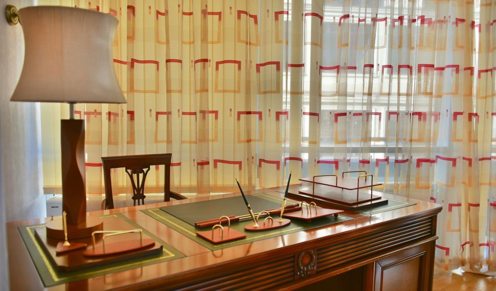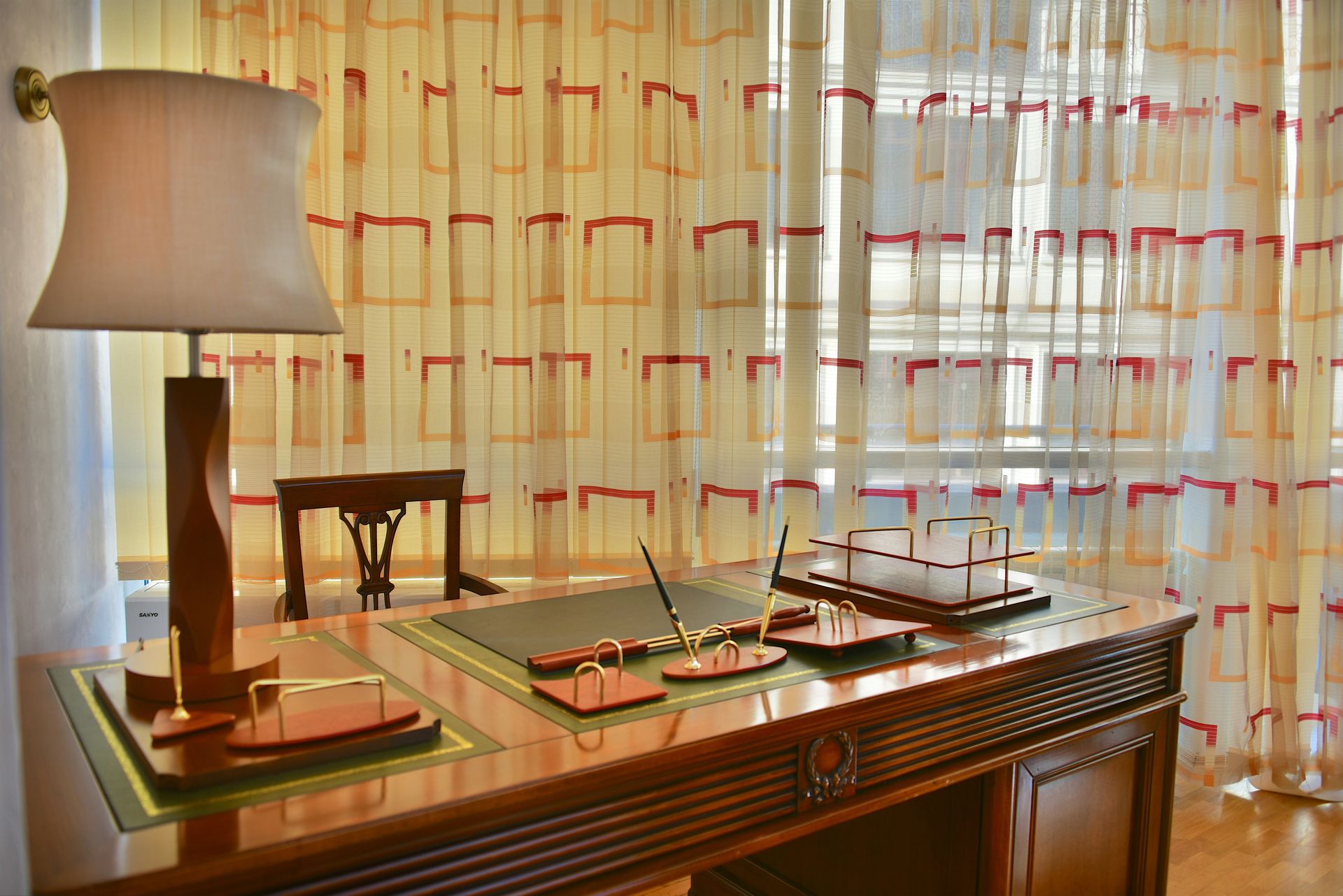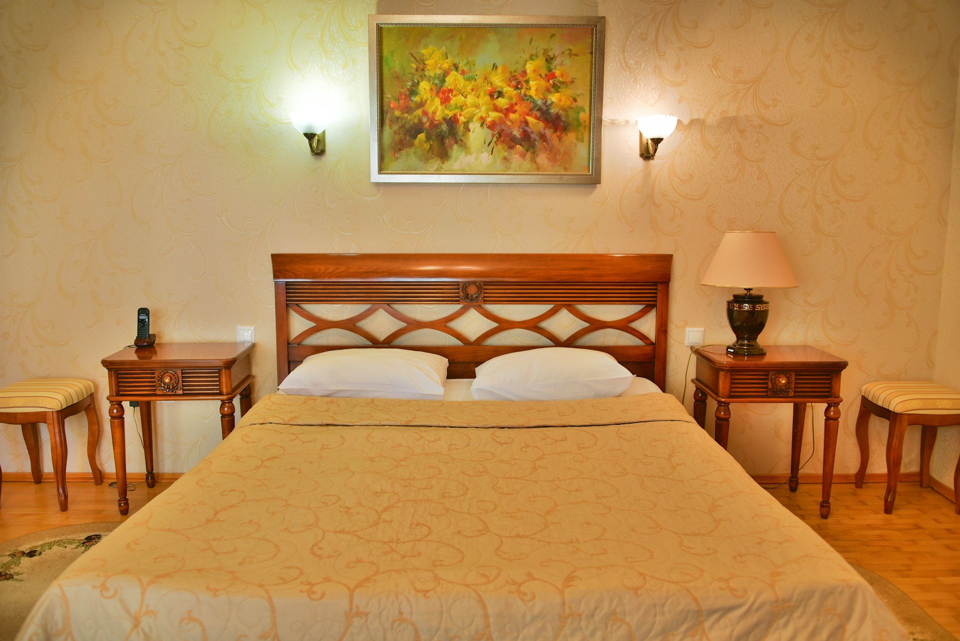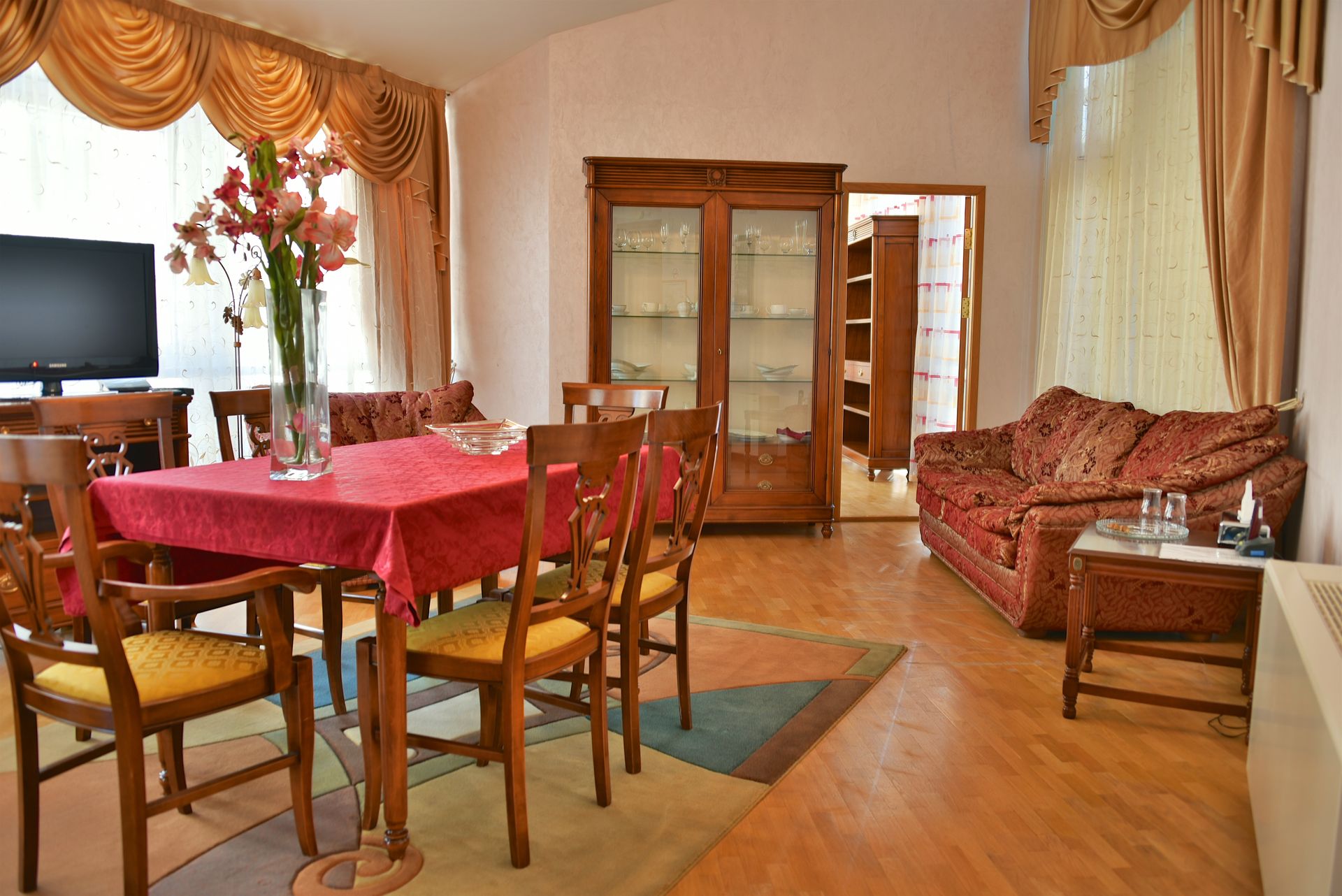 Spacious two-bedroom suite furnished with soft furniture. The living room includes a sofa, two armchairs, coffee table, dining table with chairs, TV, and safe. The bedroom features a French double bed with bedside tables, dressing table with mirror, bench, and wardrobe. The bathroom includes a large bathtub, hairdryer, and toiletries kit. The suite also has a study area: writing desk, desk lamp, chair, and bookshelf.