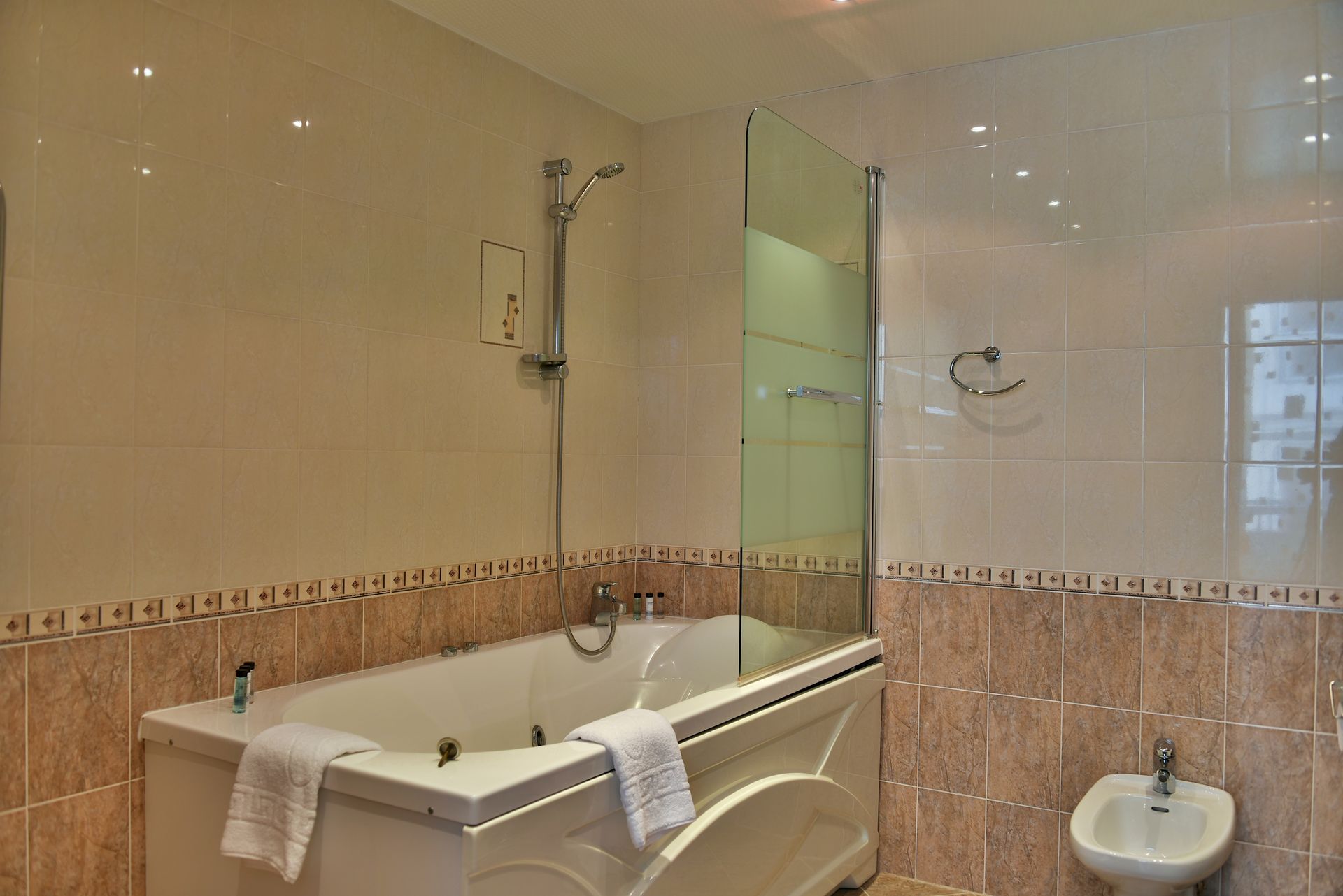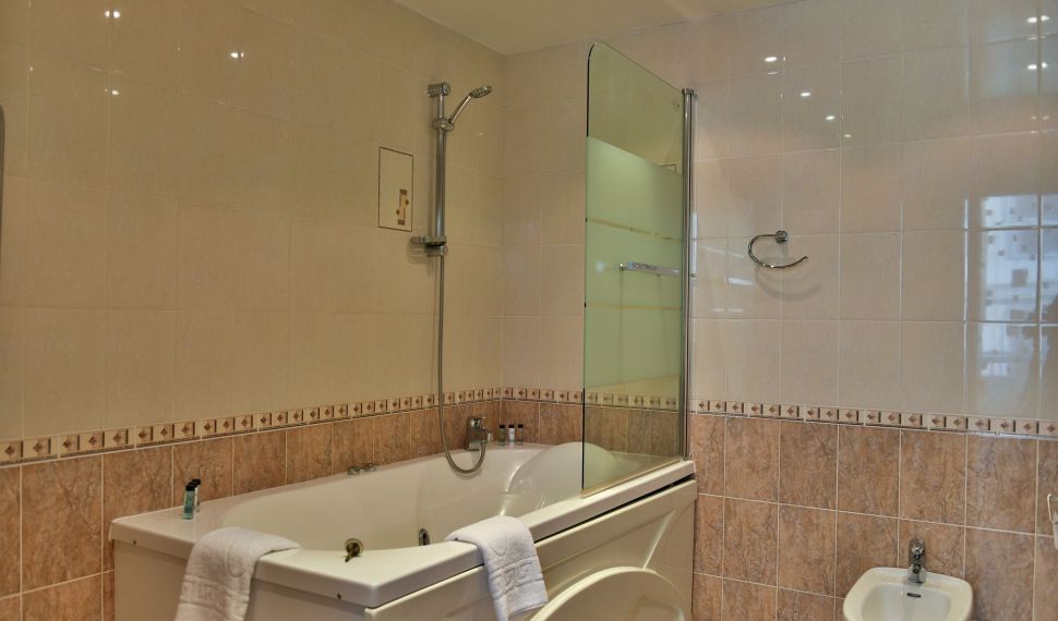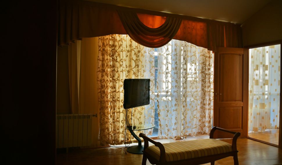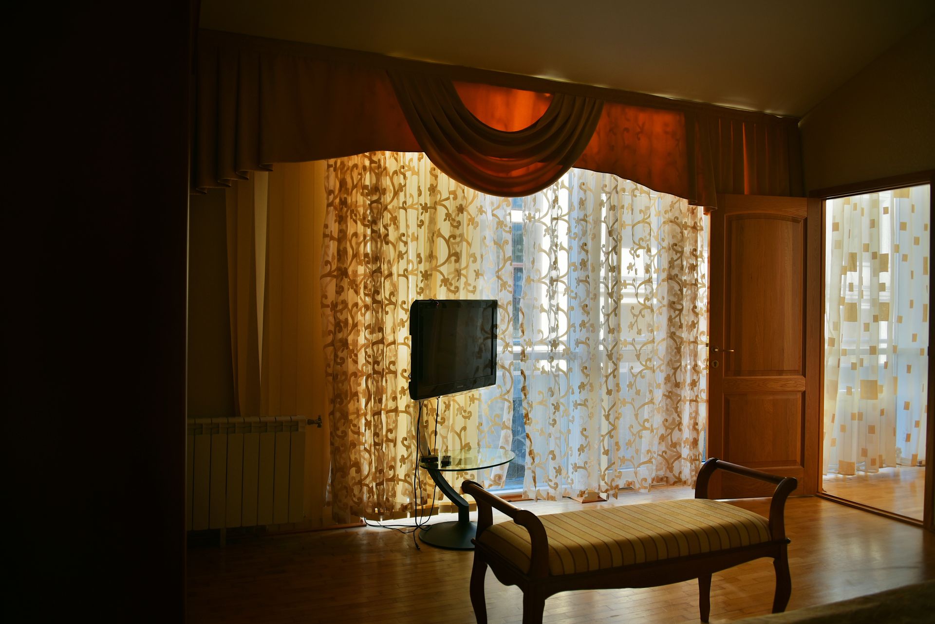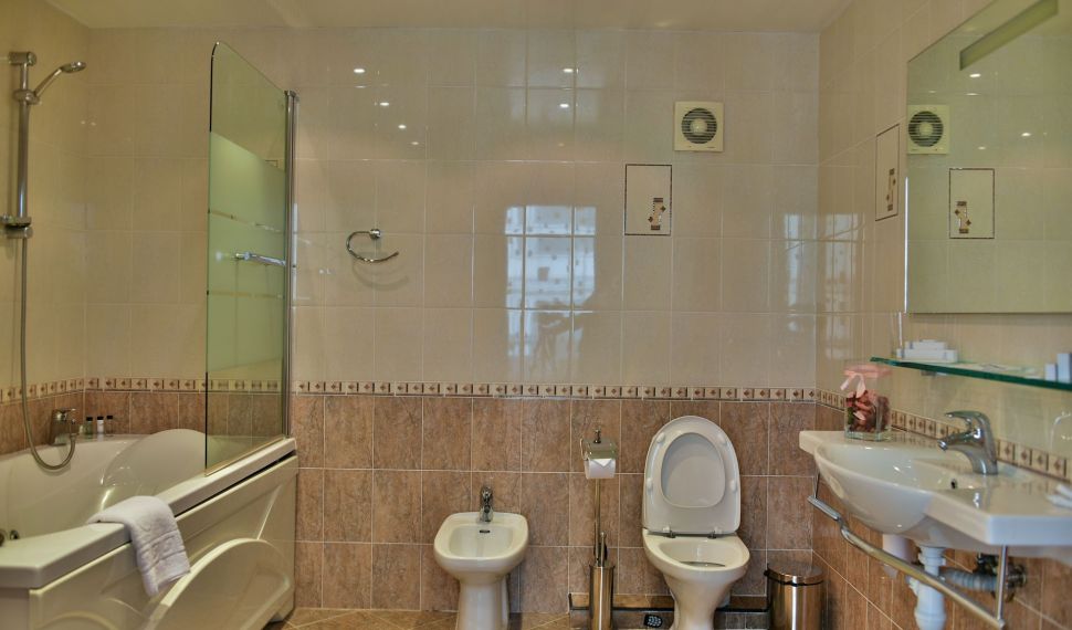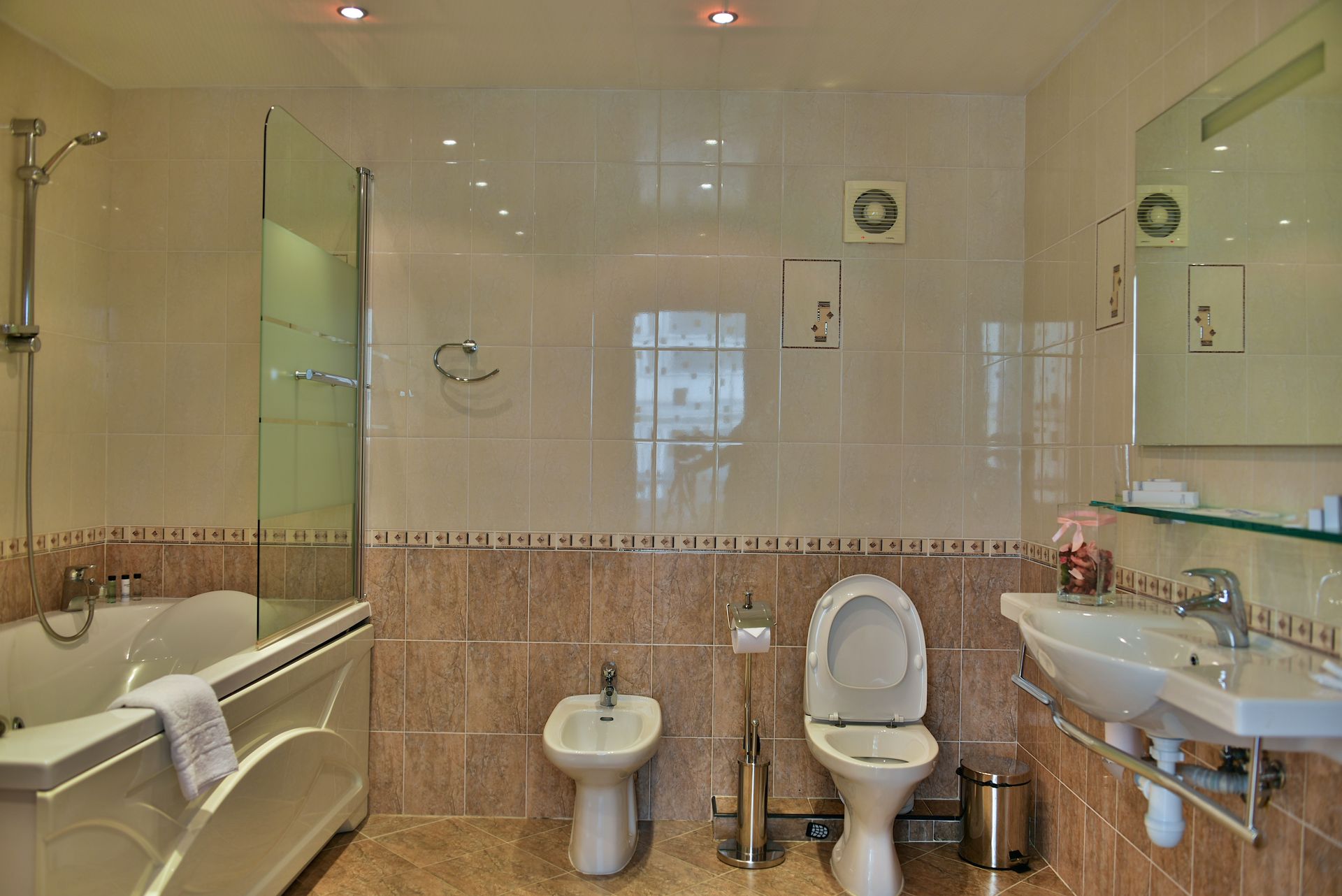 Spacious two-bedroom suite furnished with soft furniture. The living room includes a sofa, two armchairs, coffee table, dining table with chairs, TV, and safe. The bedroom features a French double bed with bedside tables, dressing table with mirror, bench, and wardrobe. The bathroom includes a large bathtub, hairdryer, and toiletries kit. The suite also has a study area: writing desk, desk lamp, chair, and bookshelf.