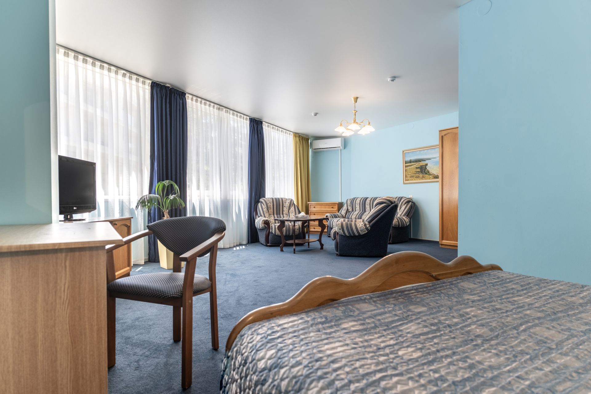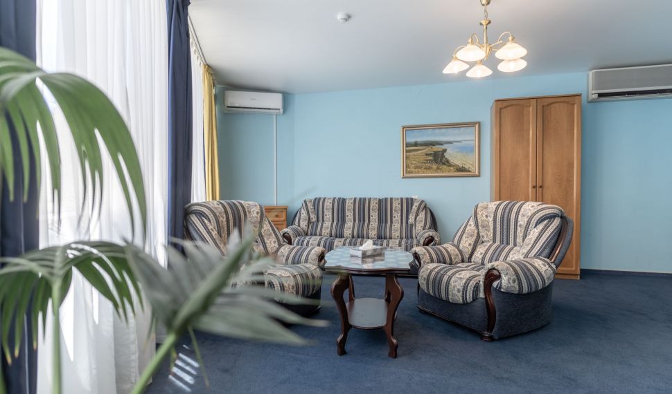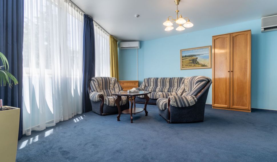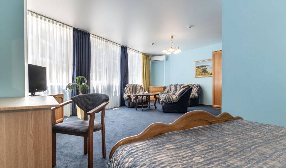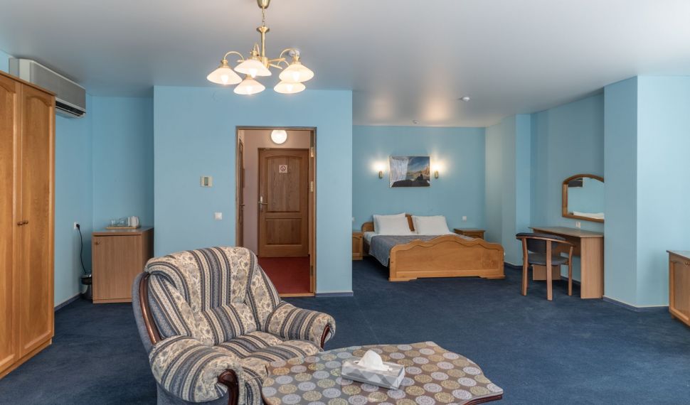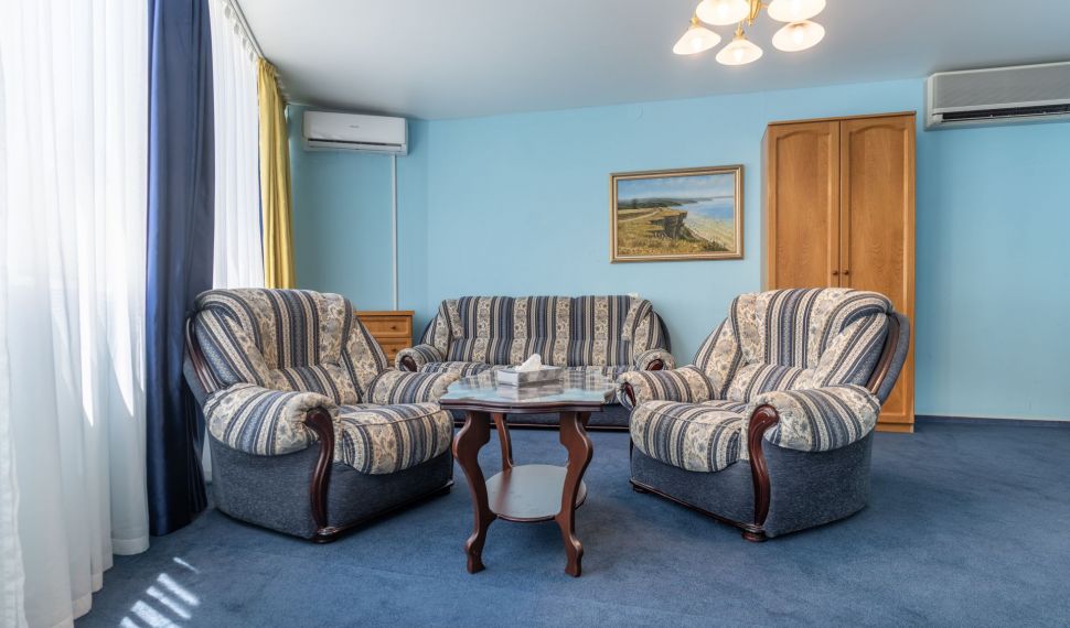 Spacious room divided into two zones: bedroom and living room. Includes comfortable soft furniture (sofa and two armchairs), coffee table, dressing table, wardrobe, safe, large double bed, bedside tables, air conditioning, and TV.
