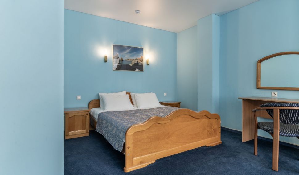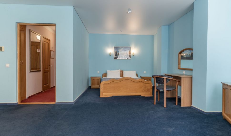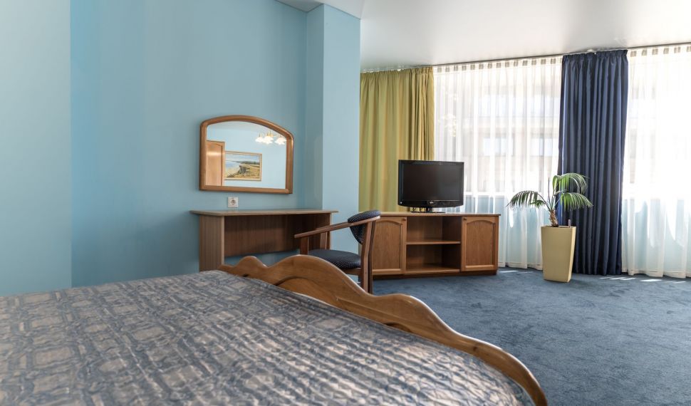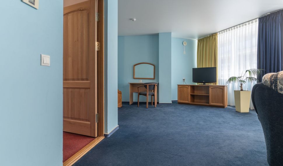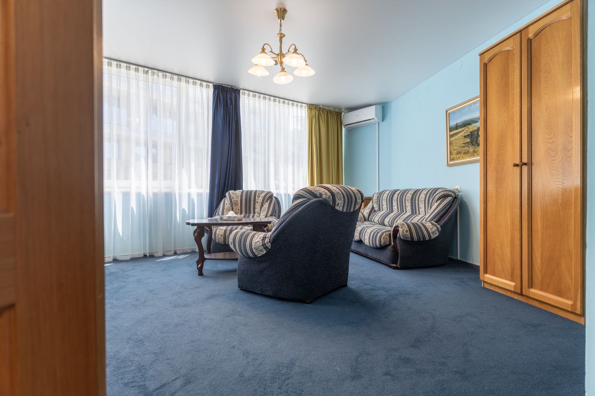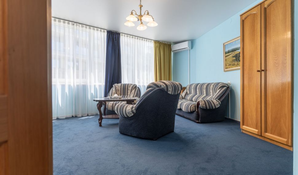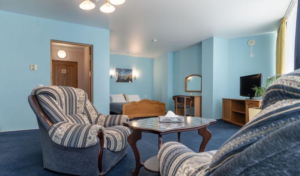 Spacious room divided into two zones: bedroom and living room. Includes comfortable soft furniture (sofa and two armchairs), coffee table, dressing table, wardrobe, safe, large double bed, bedside tables, air conditioning, and TV.
