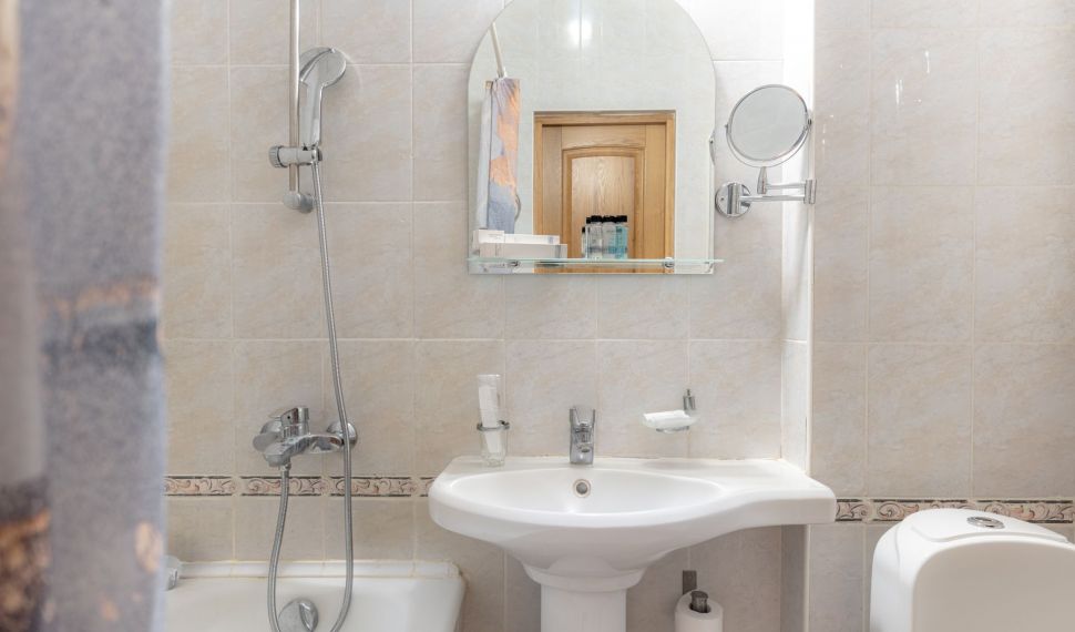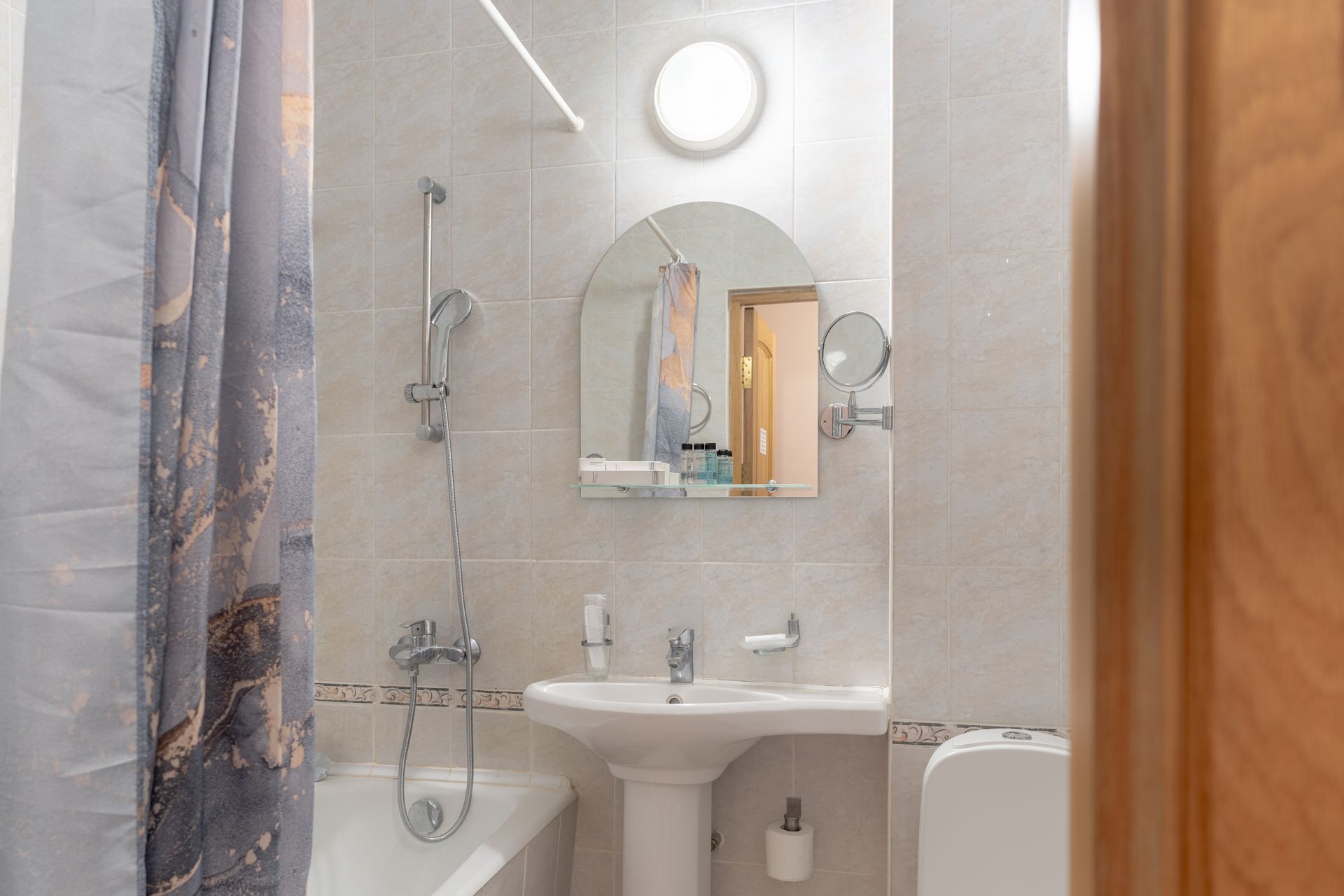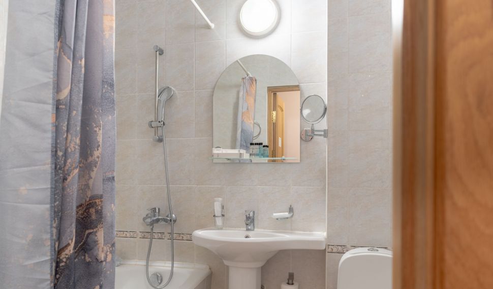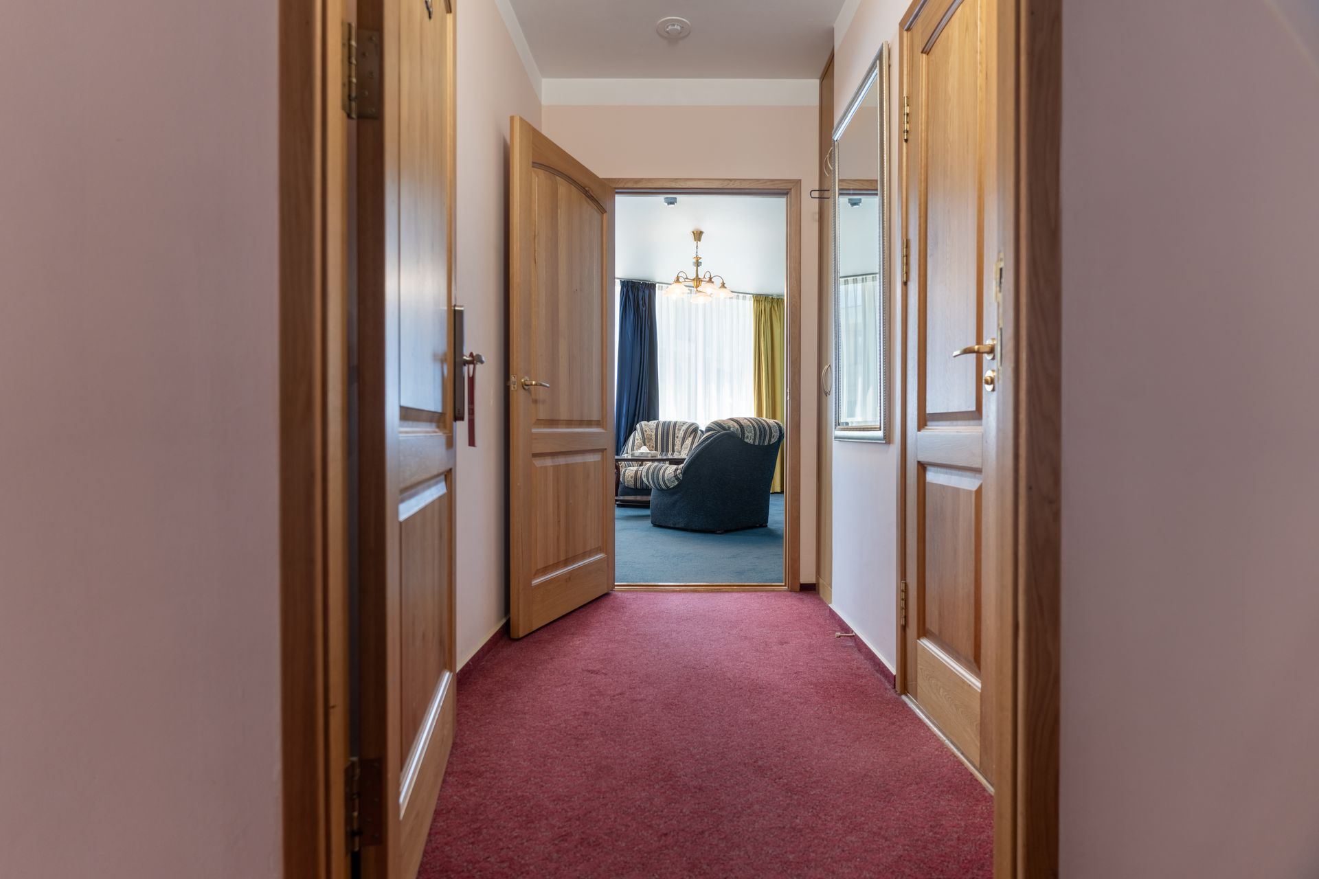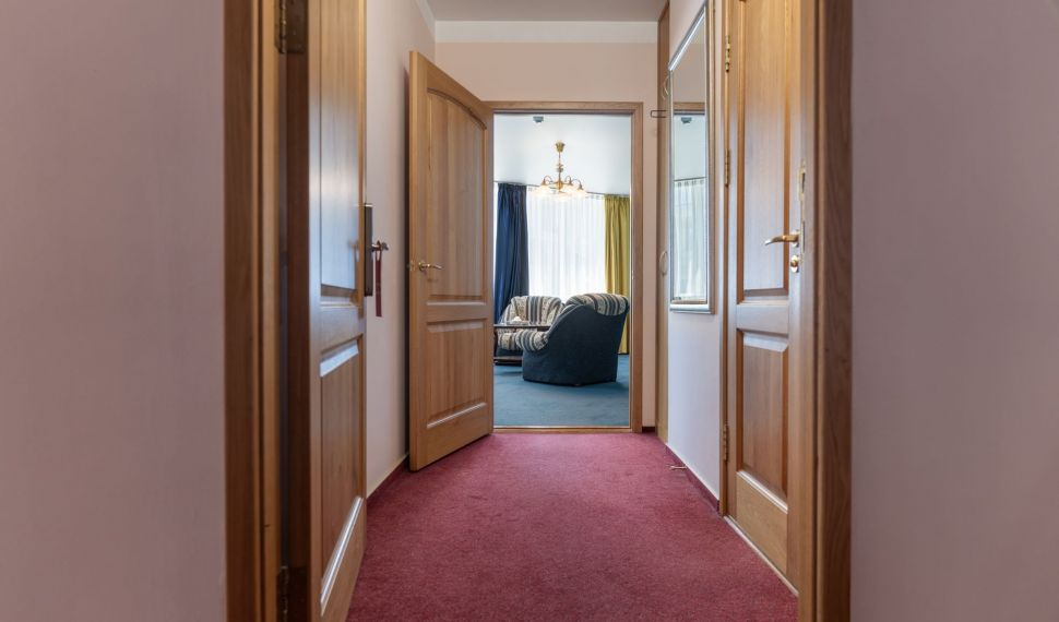 Spacious room divided into two zones: bedroom and living room. Includes comfortable soft furniture (sofa and two armchairs), coffee table, dressing table, wardrobe, safe, large double bed, bedside tables, air conditioning, and TV.
